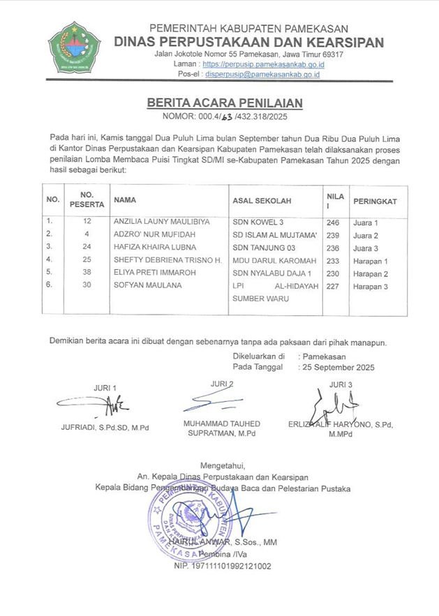 Setelah melalui persaingan yang ketat, para dewan juri akhirnya mengumumkan pemenang. Sorotan tertuju pada peserta cilik dengan penampilan memukau, Anzilia Launy Maulibiya dari SDN Kowel 3. Anzilia berhasil menyabet gelar Juara I dalam kompetisi bergengsi ini, mengungguli peserta-peserta terbaik lainnya dari berbagai sekolah di Pamekasan. Berikut Berita Acara Penilaian Lomba: